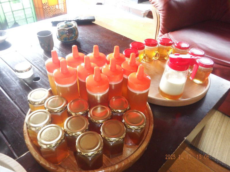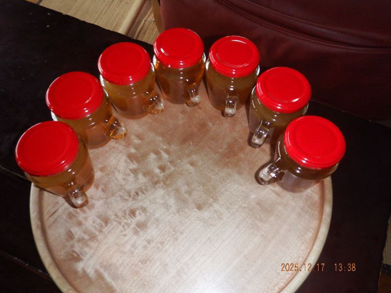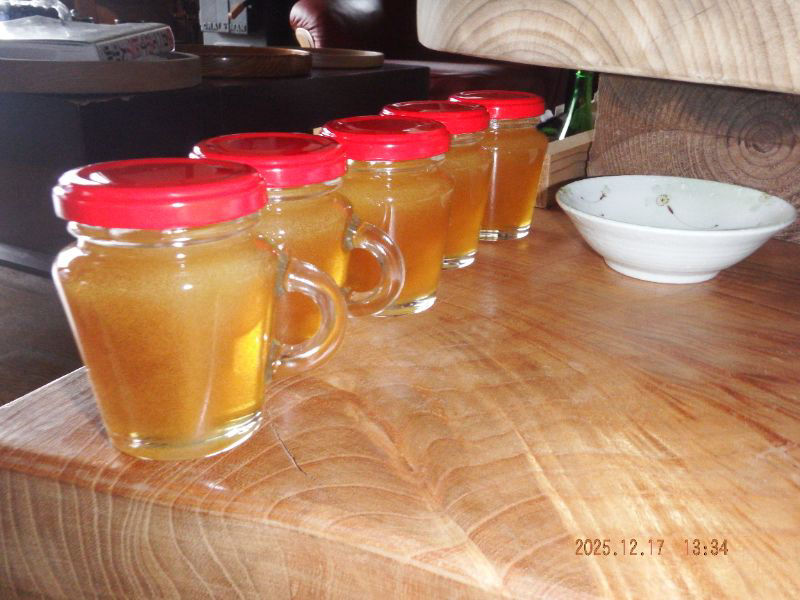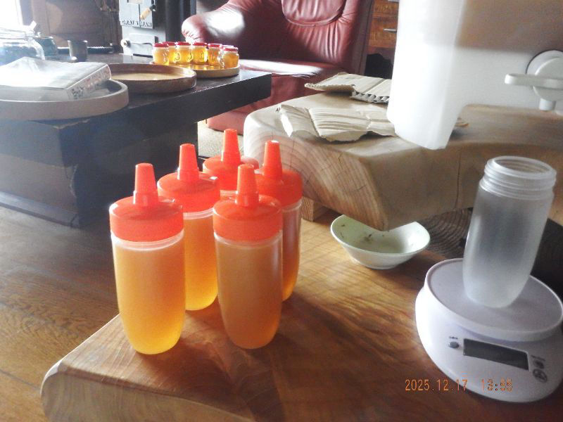 蕎麦蜜:130g×7本=910g トンガリ:300g×10本=3,000g 六角瓶130g×11本=1,430g ハニーパッカー(450g瓶)半分=225g 合計=5,565gでしたね。