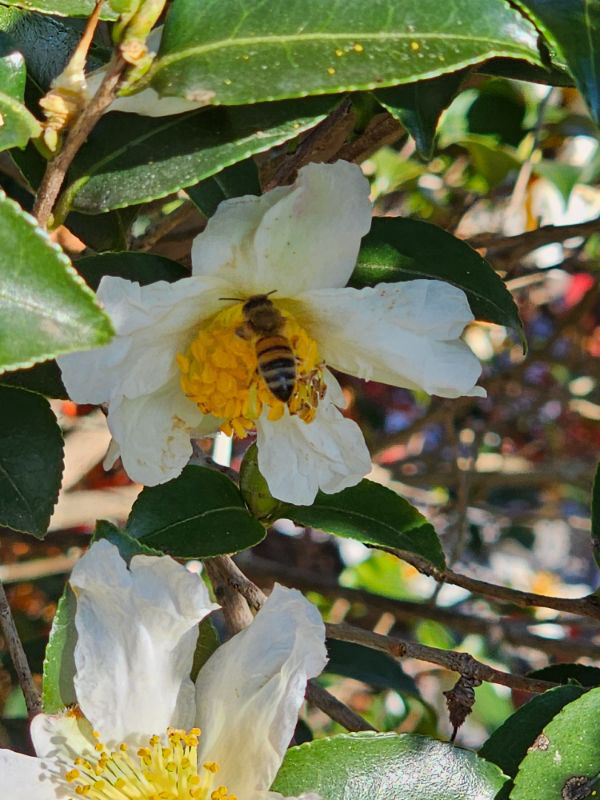 サザンカ(白)、チャへの西洋ミツバチ訪花