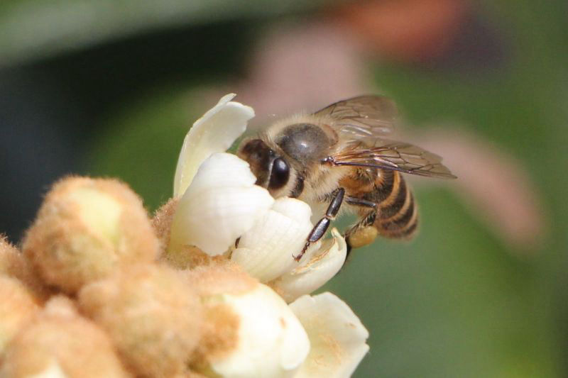 ほとんど蕾のビワの木の咲き始めた花に訪れる日本蜜蜂