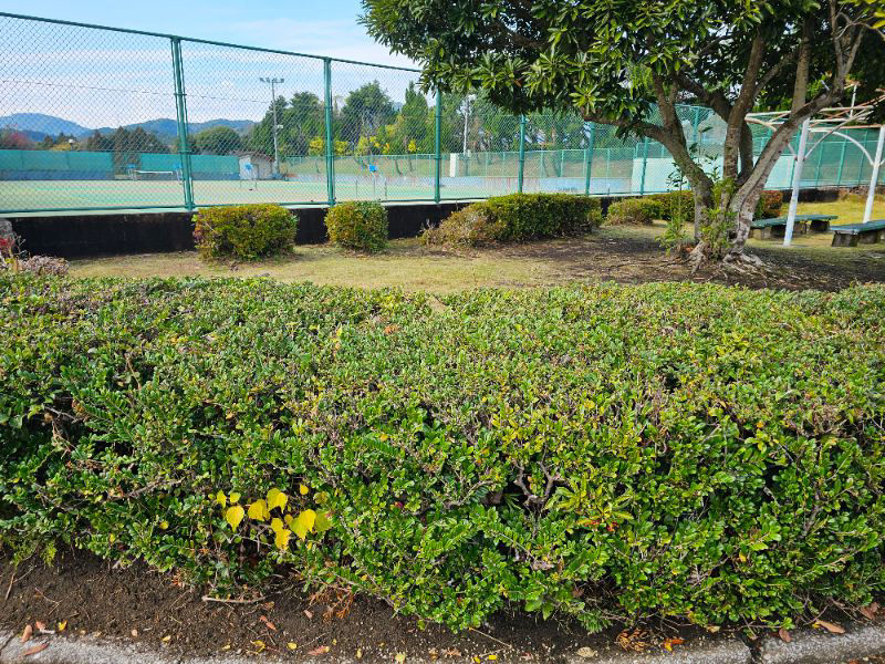 公園内テニスコート脇の生垣仕立てのハマヒサカキ