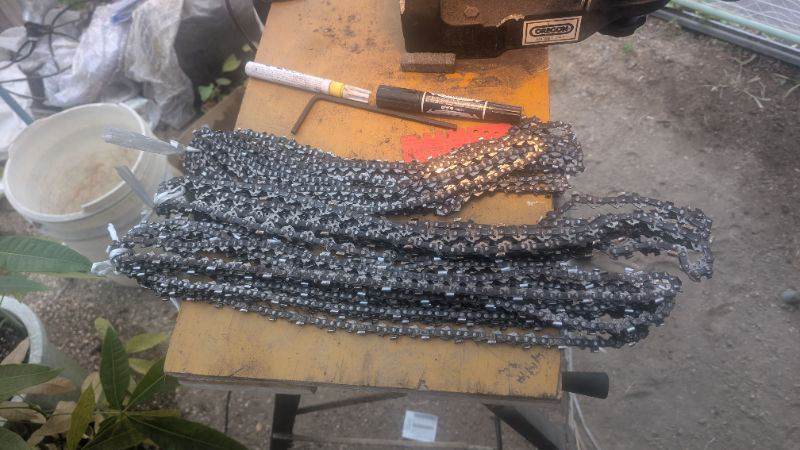 焼き芋をしながら 友達、我が家の ソーチェーンを約30本研磨しました。
