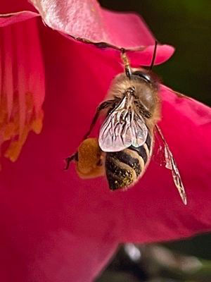 ヤブツバキは鳥に特化した丈夫な花の作りでニホンミツバチには少し大きすぎなのですが持前の適応力で花粉も蜜も集めているようです。私が写真を撮っていると「邪魔邪魔~」って感じでブーンされます。ニホンミツバチはツバメは天敵として追い払うことがあるようですがメジロはどうでしょうか??佐渡の場合は多分onigawaraさんにも書いたように1秒たりとも無駄には出来ない貴重な時間なので追い払ったりはせずにとにかく蜜集めに必死なようです。一方メジロからは鬱陶しい存在かもしれませんね。冬のヤブツバキをめぐるメジロとニホンミツバチの関係はどうなのかこれからも観察していければと思います。