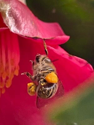 器用に持ち手を変えながらぶら下がり花粉を集めている姿は最初はカワイイーと思っていましたがよく見ると必死に見えてきて応援したくなりました。チャノキなどツバキ科の植物の花粉は粘性があるのか、または蜜をとりに花芯に入ると花粉だらけになってしまうからなのか、皆こんな感じでぶら下がりながら体についた花粉を脚で丁寧にこそいで後ろ脚のほうへ集めています。体じゅう花粉だらけだと上手に飛べないのかもしれません。まさにクリフハンガーです。そうして樹々の受粉をして森の多様性を豊かにしているかと思うと蜂娘さんは主演ではないけど助演女優賞に値するのかもしれませんね~(主演はやっぱり森ですね。)