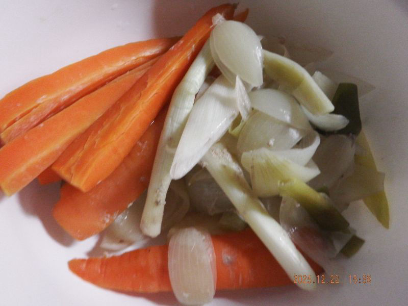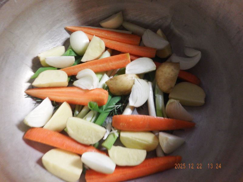 ローズマリー:2本 白ネギ:4本 ジャガイモ:3個 人参:2本 玉ねぎ:2個をカットして並べて居ますね。