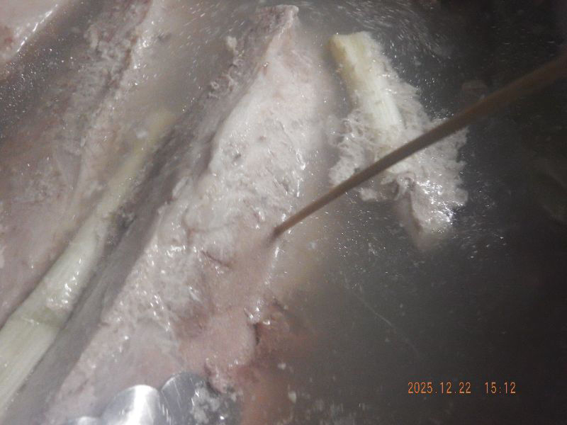 水を肉の上30mm位まで入れますね。温度計を差し込みますね。火を入れて居ますね。約1時間湯がきますね。