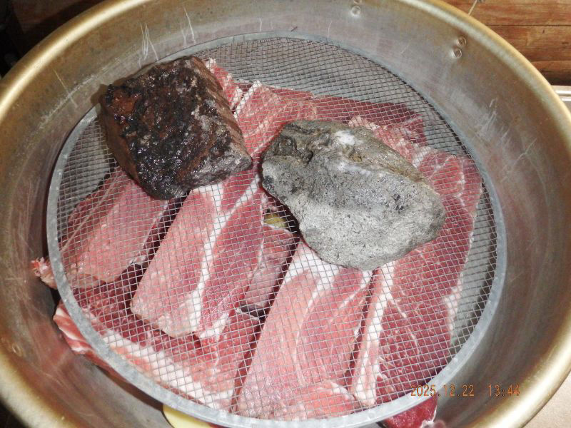 肉を8本入れて網を被せて、重しに石を置きますね。