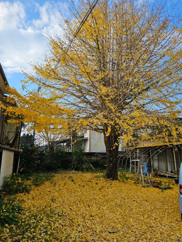 まっ黄色の紅葉イチョウもですが落葉の様子や地面に落ちた絨毯様の黄色も綺麗です。銀杏成る雌樹ではなくて庭木としてはよかったです。