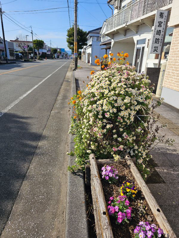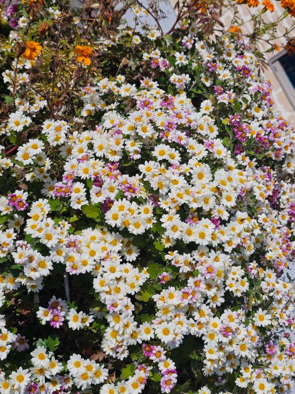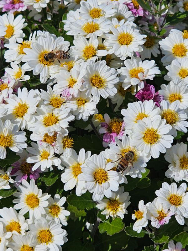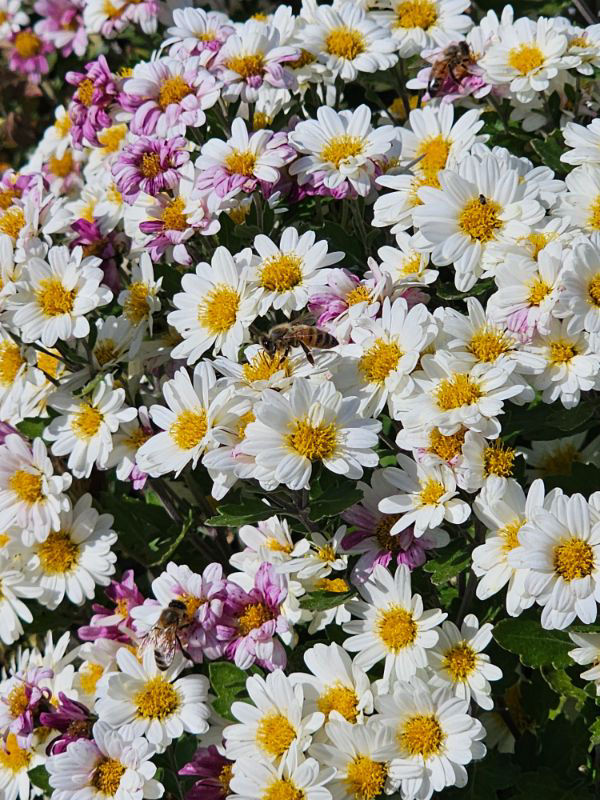 路側帯に植えられた1株の菊に多数の西洋ミツバチの姿あり