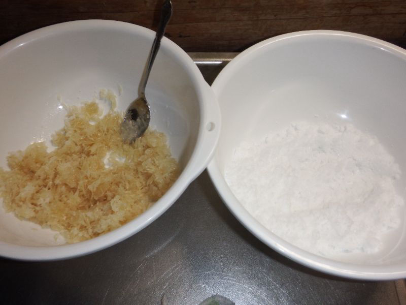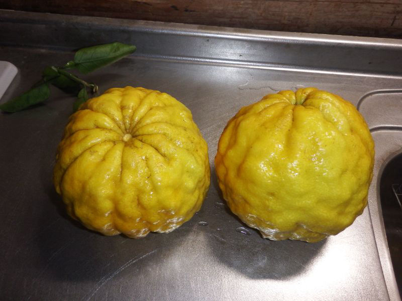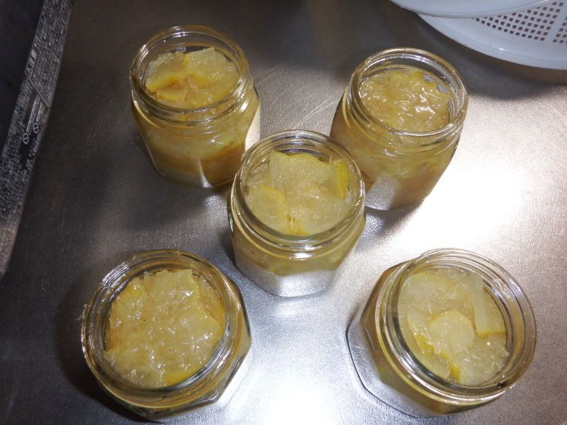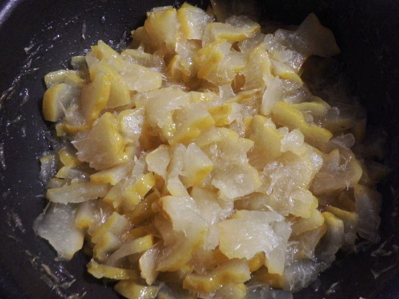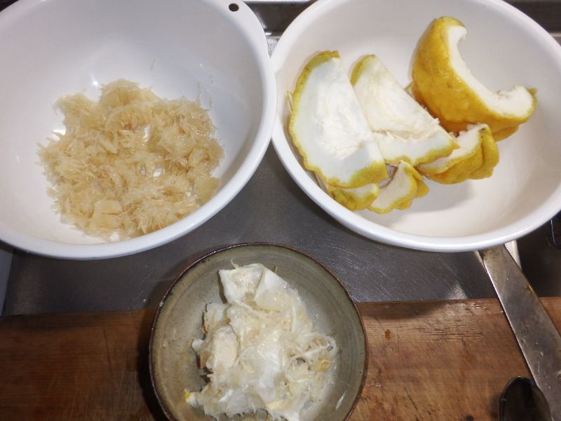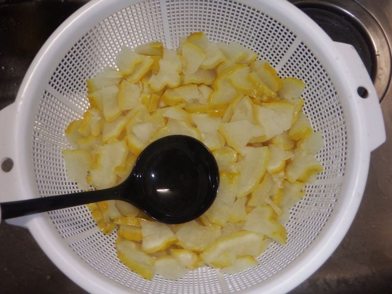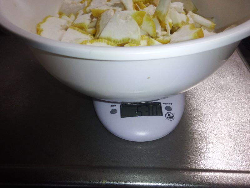 カットした鬼柚子の皮を湯がいて居ますね。5分ほどと有りましたが、8分くらい湯がきましたね。後2mmほど薄く(シンリィスライス)した方が良かったのではないかと思いましたね。