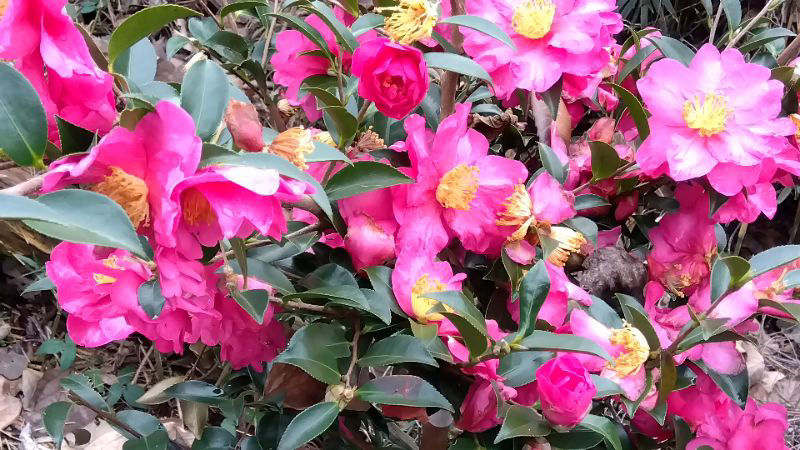 ⇩ 山茶花、10本ほどあり、5,6本良き花を付けている、訪花も有る。
