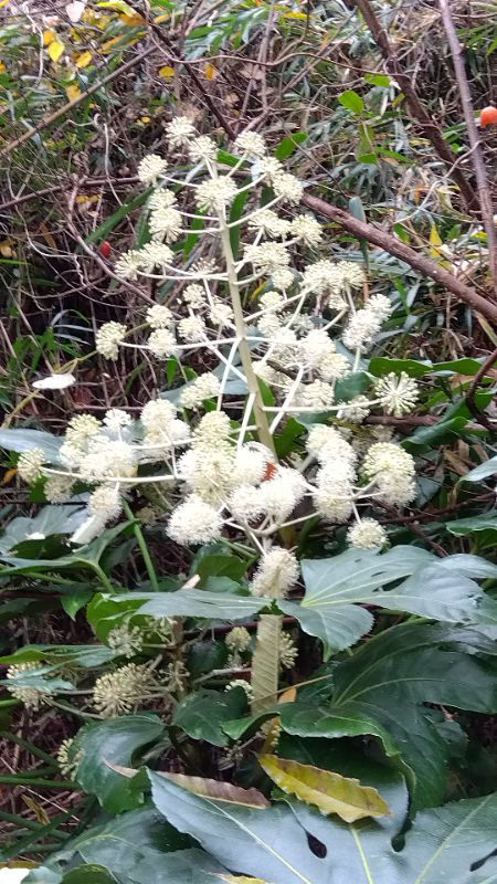 ⇩ ヤツデの花、今日もこの花に3頭ほどの訪花が見られた、花を揺らしたら飛び去った。 杉の森に入ってヤツデの苗木を10本ほど抜いて来た、20本ほど水に漬けてある。