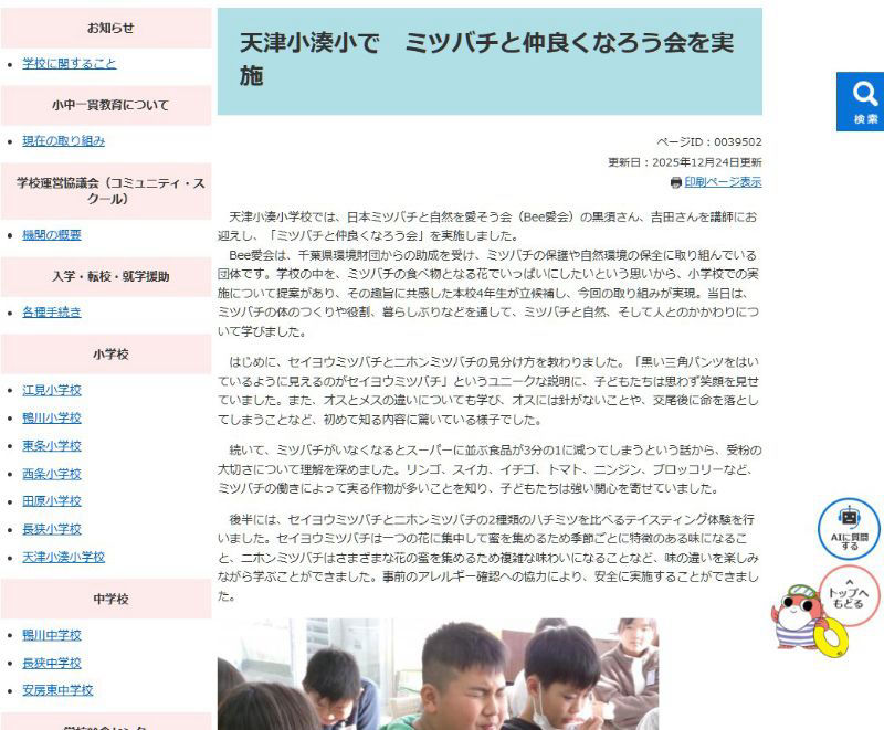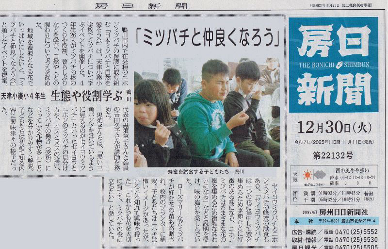 12月5日に、天津小湊小学校で開催したミツバチ保護出前イベントが、地方紙(房日新聞)に掲載されました。