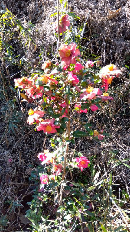 ⇧ ⇩ 山茶花への訪花、この山茶花は良く訪花する。既に花びらが霜に遣られている。花が柔らかいのか、花蜜が良いのか、木は若い。他の立派で霜にも強い山茶花には訪花少なし。