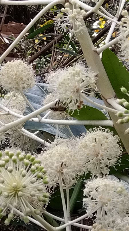 ⇧ ⇩ 日陰のヤツデ、花はユックリ咲いている。良く訪花している。 花のヤツデが15本ほど有るが日向より日陰の物が万事良い。ヤツデ苗を20本ほど日陰に植え付けた、3,4年後が楽しみ。