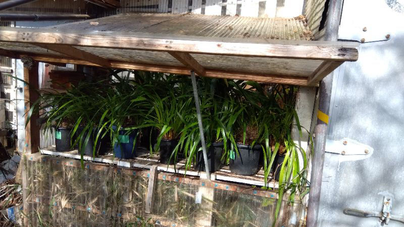 大晦日。 1週間程前、草藪からポリカ小屋に移したキンリョウヘン、ゴットン鉢に灌水。 ゴットン鉢3個中1鉢に2個の花芽のみ、キンリョウには花芽無し。杜撰であった。