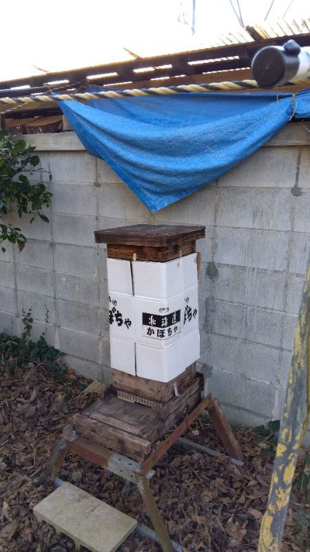 ⇩ 正月2日は雪とか言っていたので、蜜柑群に防寒用段ボールを巻き付けた。ヒッソリカンとして、出入り無し、ガタガタやったら4,5頭ブンブンやり出した。刺されたくないので、作業止め、他の群に移動。屋根用鉄板は後でする。