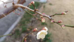 庭にある梅が咲きました。ミツバチの訪花はまだ確認できていません。鳥がついばんでいます。