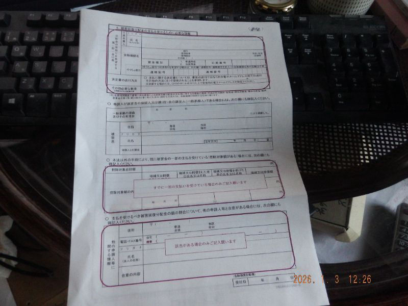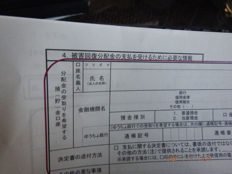 被害回復分配金の支払いを受けるための書類ですね。12月に直接銀行より電話が有って居たので、間違いでは無いですね。思いもしないお年玉になりそうですね。(僅かな金額ですが嬉しいですね)