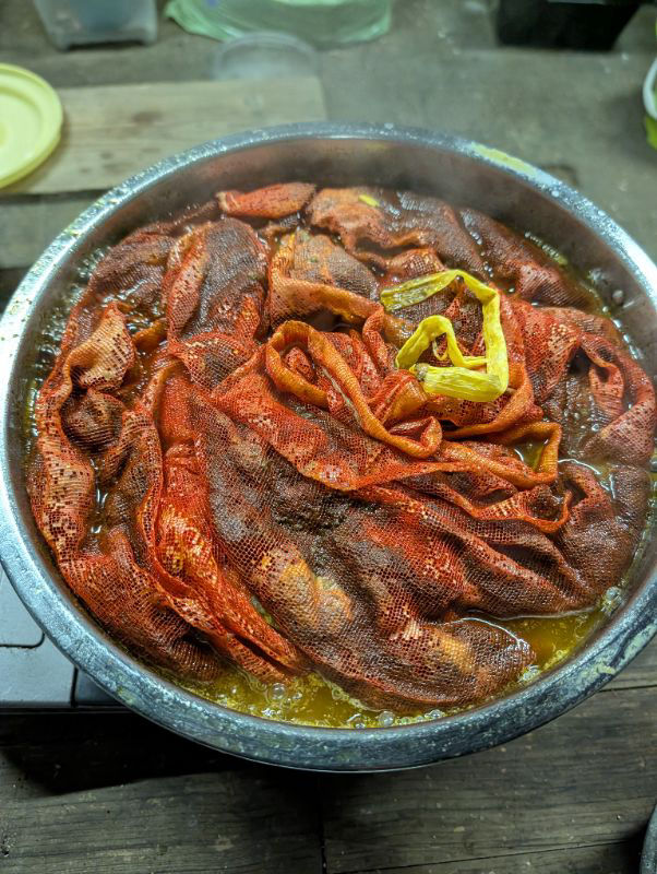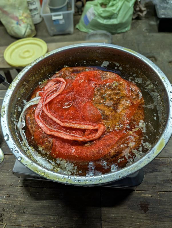 昨年圧搾器を使って採蜜した巣板を冷凍保存していましたが家族に見つかってしまい仕方なく、蜜蝋作りをしました。