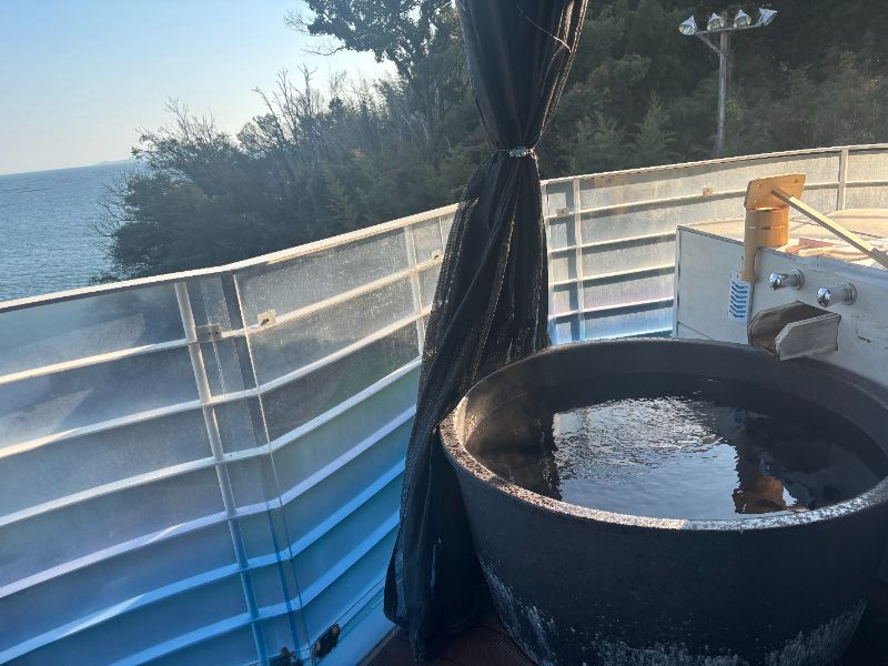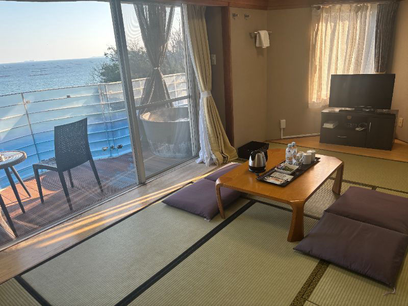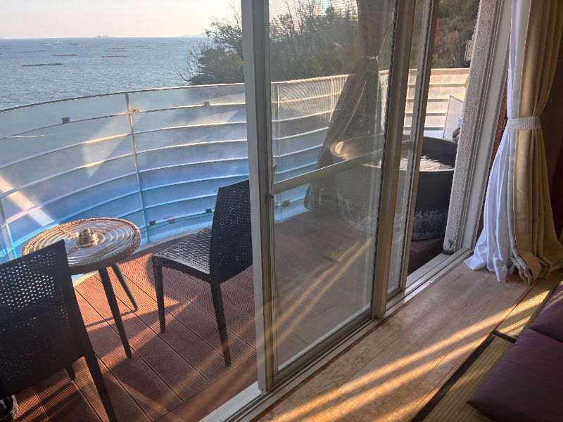 今回は播磨灘を望むオーシャンリゾートホテル。いつものとおり露天風呂付客室の選択ですがスィートルームになり、ベッドルーム、和室2部屋、台所、バルコニー2か所、トイレも2か所有り、これは2部屋を1部屋に改装したものと推測されました。
