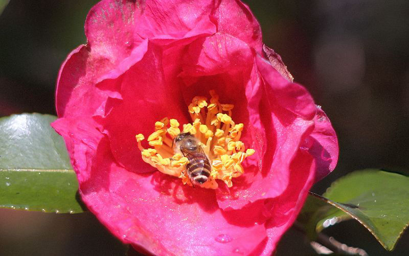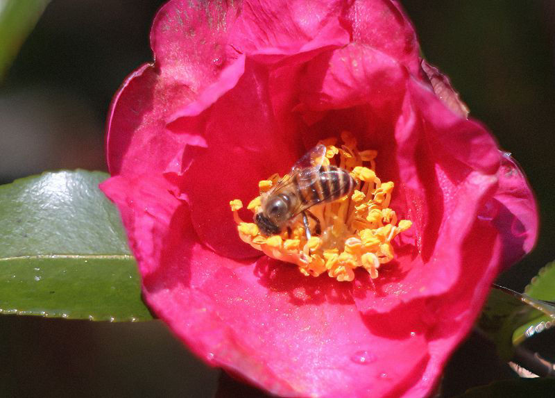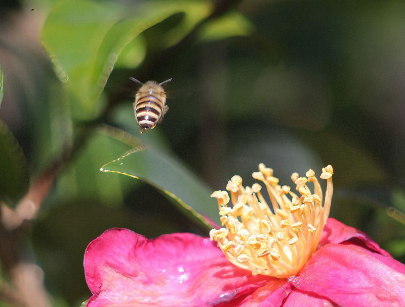 大分山荘にて:山茶花に訪花する日本ミツバチですね。