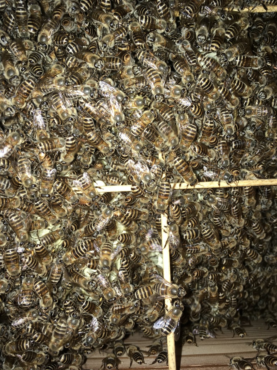 今年入居の群れが3段近くまで巣が伸びていましたが、まだ少し早いので箱の継ぎ足しは見送りました。その写真がこちら