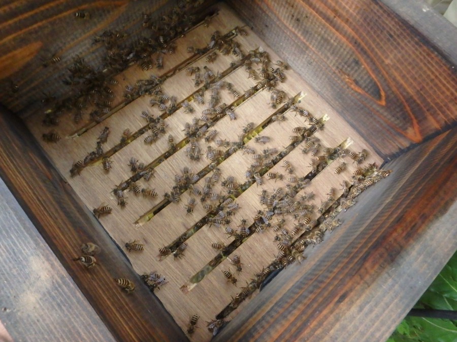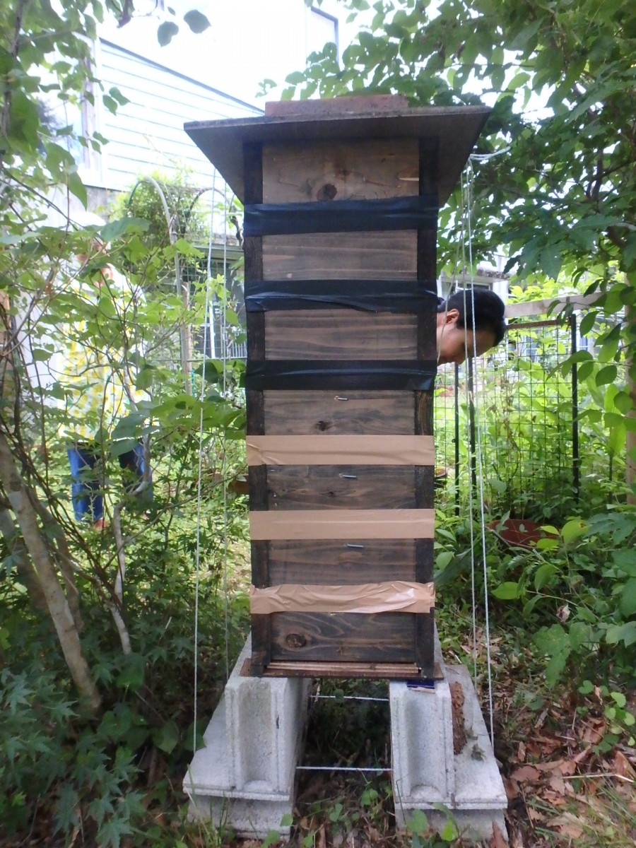 うちの別荘から 車で一時間ほど山道登って降って、 丹沢自然保護協会理事長の営む 国民宿舎丹沢ホーム群れを 内見、 ほぼ三段一杯まで 増えている。 では 箱二つ巣落ち防ぎ針金付きのを継いで、 巣門箱の針金は 邪魔になるから 引っこ抜いておく。