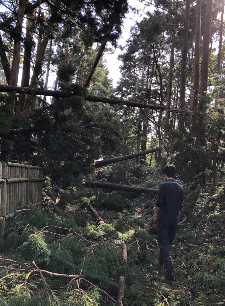 森の男性陣はたくましく チェーンソーで切ってユンボで運んで通れるようにしていました!凄い!