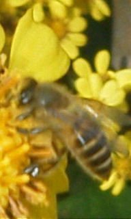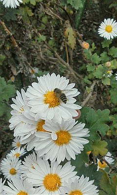 午前10時過ぎると、花壇の菊の花に5・6匹訪花していました。菊の花に訪花しているのを初めて見ました。我が家の虎の子のハチさんだと思います。