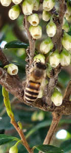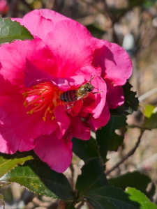 明けましておめでとうございます。サザンカを訪れる日本みつばちです!!