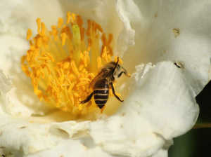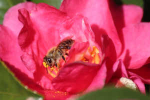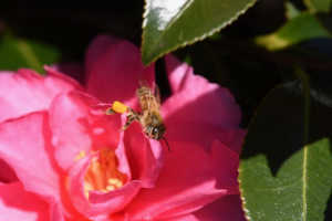 花粉重くても頑張ります〜サザンカの西洋ミツバチ