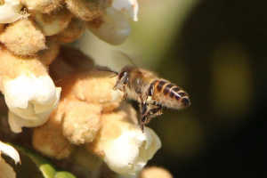 ようやく琵琶の花にたくさんの日本ミツバチが訪花