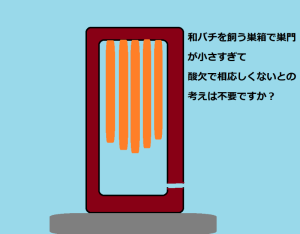 初心者おじさん様 すべて4面巣門ですか、4面巣門で1辺が9㎝と言うのが良く分かりませんが、4面であれば3面塞いで南向きの1面のみ開放で幅4~5㎝程度で良いと思います。