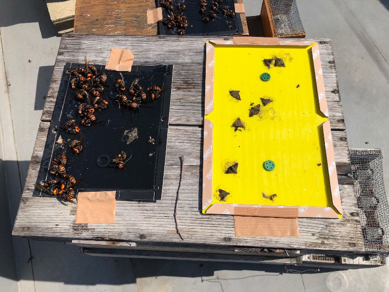 今年はオオスズメバチが異常に早くから多く、6月から巣門にトラップを付け、8月上旬から粘着シートを使いだしましたが、何故か鳥の粘着事故は1件もありません。去年と今年の違い、原因はよく分かりません。