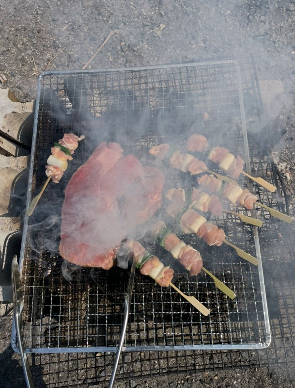 私はたまに蜂場で箱の重石で使っているブロックと残った炭を使って1人焼き鳥をお昼休みにしていますw↓