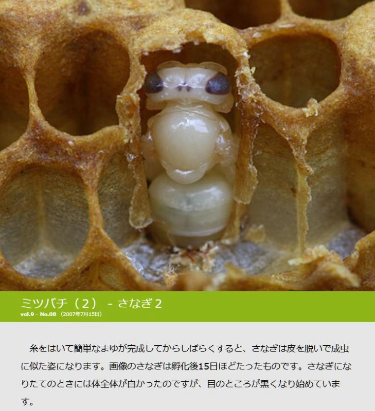 ハッチ@宮崎さん こんにちは。西洋ミツバチの場合ですが、産卵後3・4日で孵化し、幼虫で9・10日で蛹になり、14・5日で羽化。という流れですね。