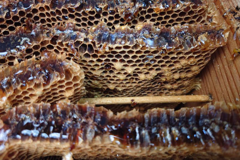 今回、蜂数は増えている様子と、蜜ダレが起こっている。すのこからスムシの形跡が見える。