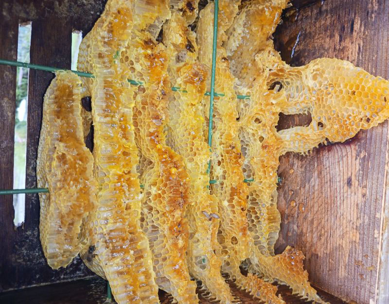 スムシの糞が今現在も落ちるのであれば、もっと下の方だという事でしょうね。でも、一度切った巣板は、またぶつ切りにするのは危険です。