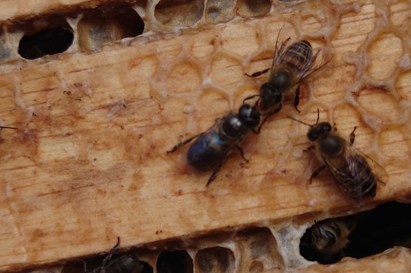 動画から見ると、雄蜂は、働き蜂の大きさと殆ど変わらない小柄な雄蜂です。それ以外の女王不調または不在の兆候としては、腹黒テカテカ蜂が結構居ます。目の状態から、働き蜂ではあるのですが、腹が黒くてテカテカ光って見える蜂が出現する事です。この2つの現象から見ると、6月の夏分蜂の後、新女王は、交尾活動に失敗した可能性が在ります。実は、うちの枝垂桜群が、正にその少し先を行く衰退群なのです(৹˃ᗝ˂৹)