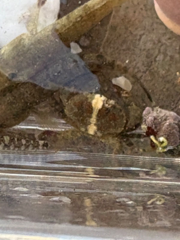 みるくさん こんばんは。そのカニの白線は、隣の石についているモノと同じように、水生生物がカニの甲羅で暮らしたものと思います。脱皮をしないで居ると、カニの甲羅には、フジツボすらくっついてしまう事も在ります。