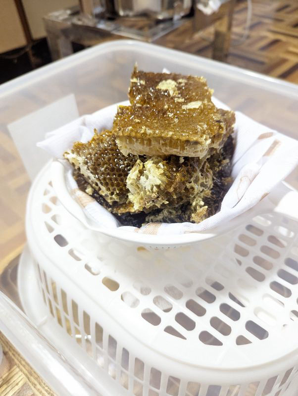 貯蜜されている巣板は花粉が混じると濁りが出るのでカッターナイフやピンセットで丁寧に取り、ボールに入れて軽く潰し、別のボールに2本の橋(角棒がいい)を渡した上にふるいを置いて潰した巣を入れて蜜を垂らせばいいのです。