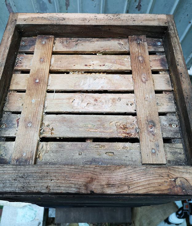 底板にはハガキ大の穴が有り、これには1mm角のステンレス金網が張ってあります。冬場は蓋をします。底板掃除で引き抜きますと、ミッチーが網に沢山くっ付いております、用心してはずします。