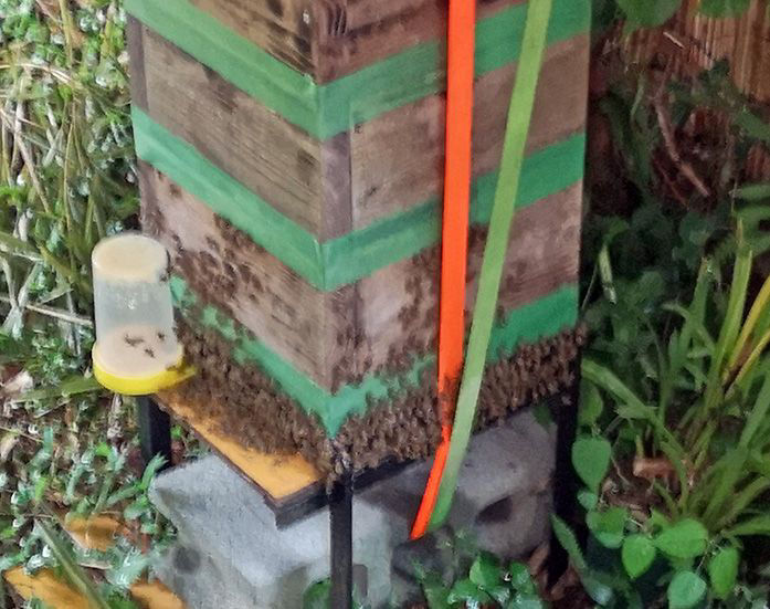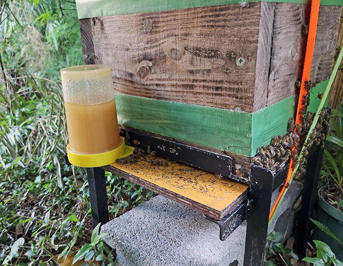試しに巣門から給餌をしましたが、1日300mLが空になってしまいましたので、3日間続けて給餌してみました。(これは蜜枯れ解消の為の緊急だったので、巣門からやりましたが、すのこ上での給餌の方が安全です。蟻や盗蜂に見つかりにくいですから)