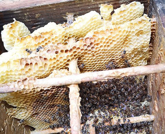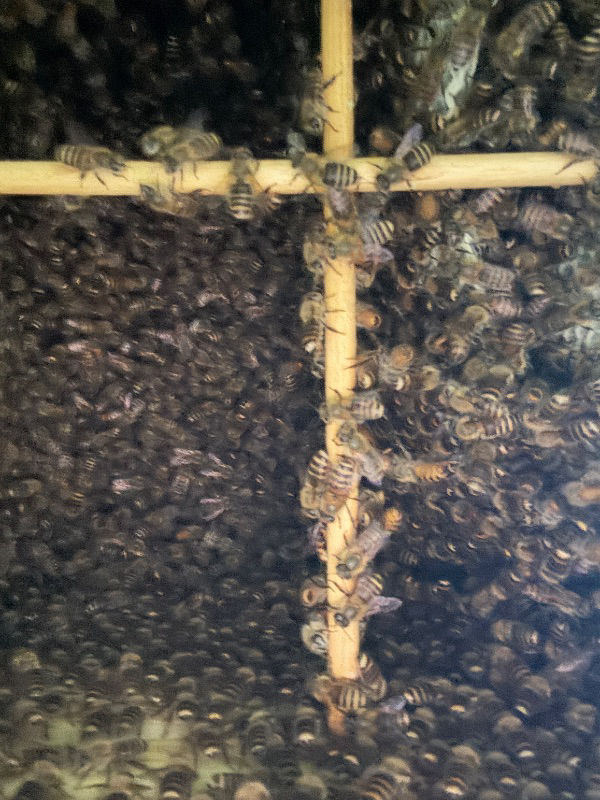 これは、スムシの台頭の為に、無駄巣切りをした時の様子ですが、この太い棒に、隙間なく巣板が接着している様子が解ると思います。