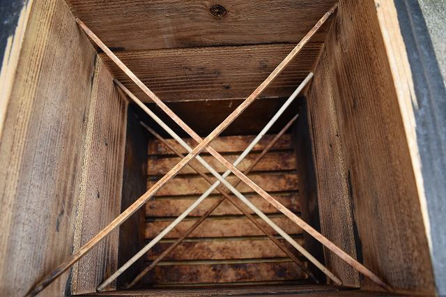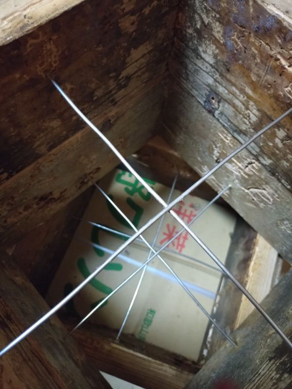 うちの重箱用の待箱は、最上段にトップバータイプの三角の傾斜付けたスノコ、棒無しの一段、スノコ向きに直交する向きの二の字に2本棒を渡した一段、巣門段、の構成でここ数年は仕掛けています。
