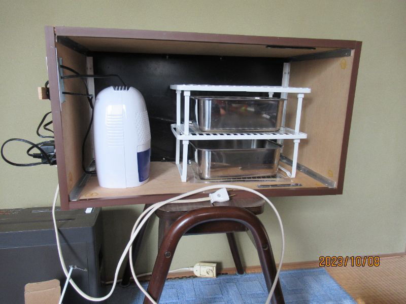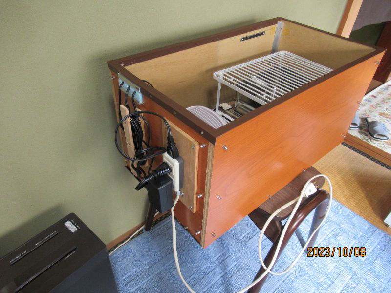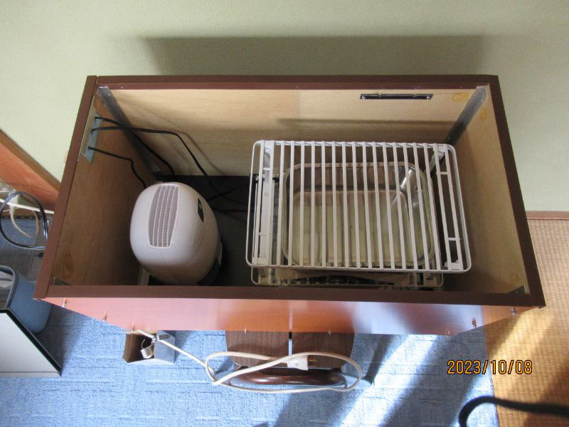 他の人と微妙に違う点は、USB給電の小型ファンをモバイルバッテリーと一緒に入れて、内部の空気をガンガンに回しています。