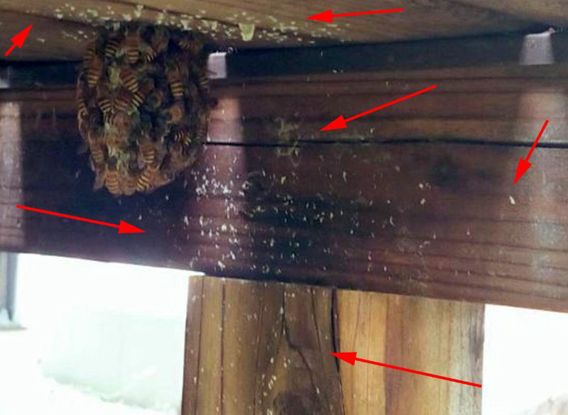 静かに見守るのが宜しいと思いますが、ウッドデッキの板の隙間が開いているようです。そこから、上に蜂娘ちゃんが飛び立つ事があると、上に居る人には不意に刺されてしまう危険もありますので、その部分の上のデッキには、仮に板を置いて、その隙間からは出ずに、下から出入りして貰う方が、お互いに安全かと思います。