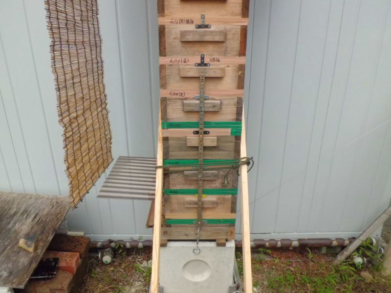 屋外で手作り木製品なので隙間が出来てしまうし、隙間はミツバチが塞ぐのに任せています。