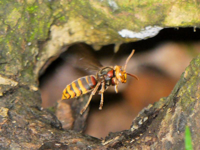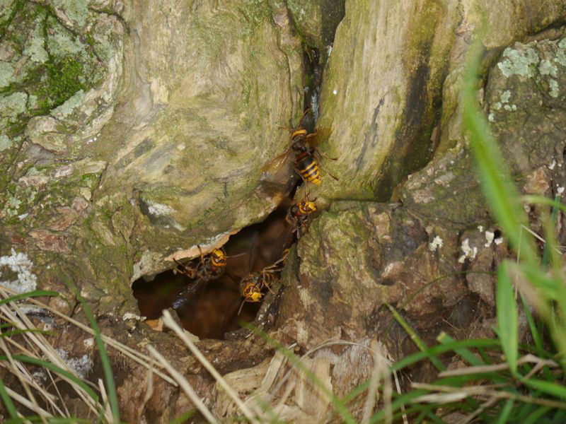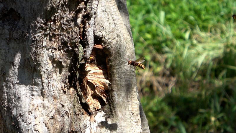 コガタスズメバチは、軒下や木の枝に、ボール状の縞々の巣を作ります。木の洞の中に作るのは、コガタでは無いと思います。
