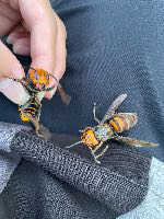 初心者おじさんさん ( ゜▽゜)/コンバンハ ウエストに近い方が黒いので、モンスズメバチですね。コガタスズメバチは反対にウエストの方が黄色いですね。又お尻の方が、4段階(幅の狭いのを入れれば5段階)の黄色と左右対称の紋が有りますので、モンスズメバチに一番似ていますね。お疲れ様でした。
